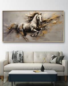 תמונת קנבס של סוסים לבן וזהב לרוחב "רכיבה מלכותית"