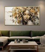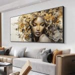 תמונת קנבס "יופי אבסטרקטי" היא יצירת אמנות מודרנית המתארת פורטרט נשי יוצא דופן המשלב גוונים חמים של זהב, שחור ולבן. העיצוב האבסטרקטי מתאפיין בטקסטורות עשירות ופרטים מרהיבים, היוצרים תחושת תנועה וזרימה לצד דמות מרשימה המעבירה תחושת ביטחון ויוקרה.