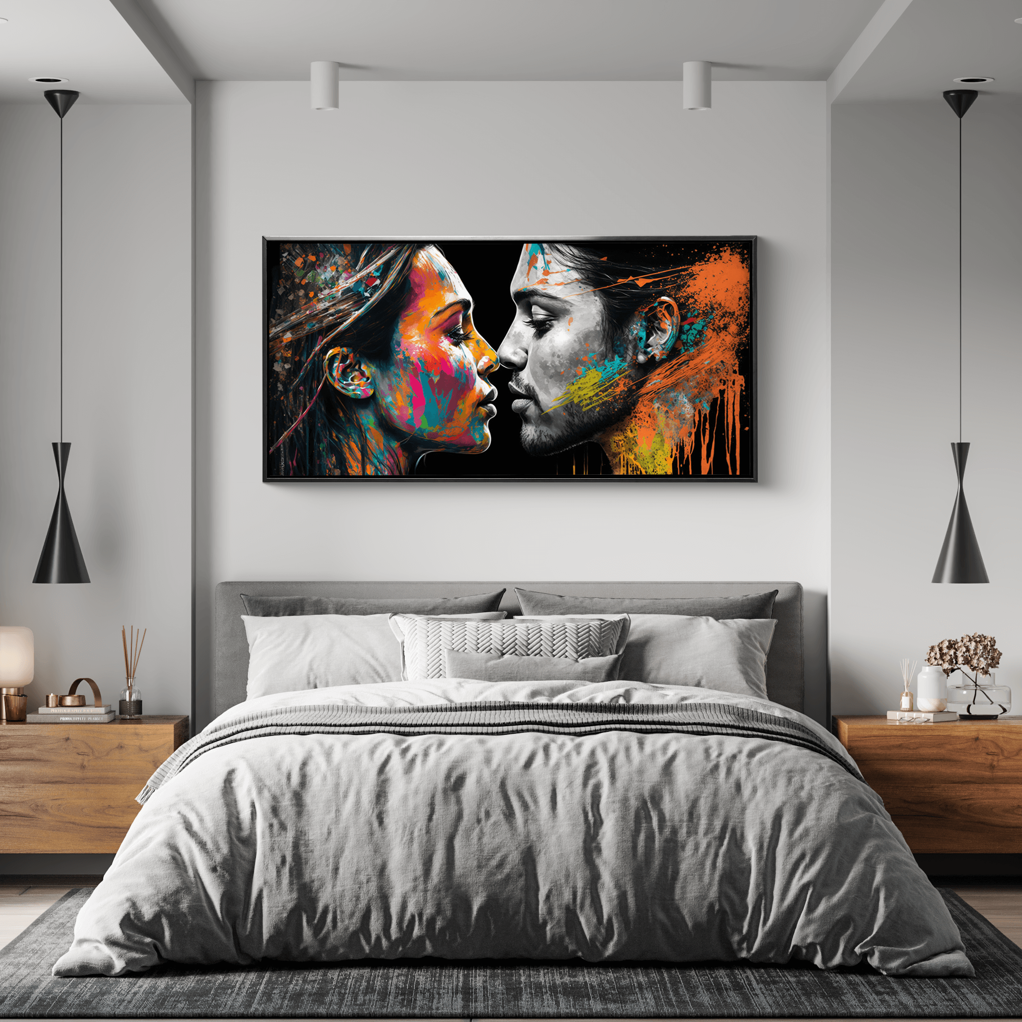 תמונת הקנבס "נשיקה צבעונית" משלבת בין צבעים חמים כמו שמנת, אדום וכתום לבין נגיעות שחור מודרניות, ומביאה לחלל תחושת רוגע, חמימות ותחכום. היא אידיאלית לסלון מודרני, חדר שינה רומנטי או משרד מרשים. התמונה משדרגת כל חלל באלגנטיות מופלאה ומשלבת אמנות עם עיצוב פנים יוקרתי.