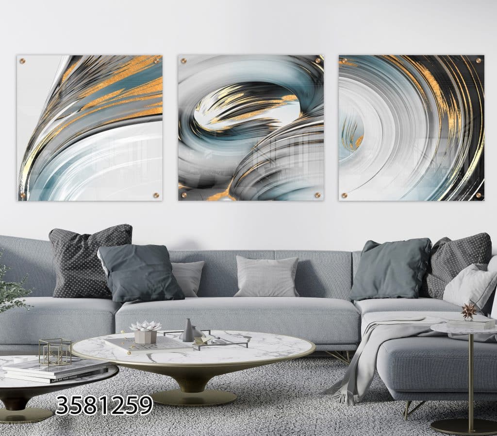 שלישיית תמונות הזכוכית המרהיבות הללו הן ביטוי מושלם לשילוב בין אומנות מודרנית ליוקרה עילאית. עם הדפסה ישירה על זכוכית, כל תמונה מציגה תנועה וזרימה ייחודיים בגווני זהב, תכלת ושחור, המעניקים לחלל תחושת עומק וממד נוסף. גימור הזכוכית המבריק מציף את הצבעים בברק יוקרתי, מה שמזמין כל אורח להתפעל ולחוות את האמנות מקרוב.