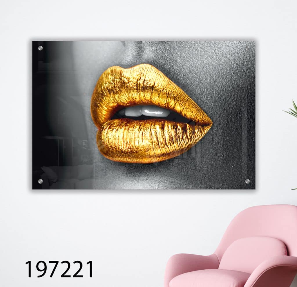 תנו לחלל שלכם תחכום עם תמונת הזכוכית "זהב אלגנטי". השפתיים המוזהבות בשילוב צבעים כמו אפור, ים וכתום יוצרים אווירה יוקרתית שמשדרת אלגנטיות וחמימות. מושלמת לסלון, חדרי שינה או משרדים, התמונה מוסיפה מגע של אמנות וסטייל לכל חלל.