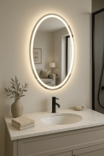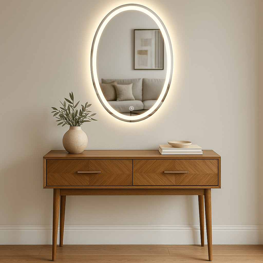 מראה "קלילות אור" מעוצבת בסגנון עגול ונקי עם קו תאורה דק מסביב לקצוות. מושלמת למי שמחפש עיצוב חדשני אך דיסקרטי, המראה זו מתאימה לחדר אמבטיה, לסלון או לחדר שינה. תאורת ה-LED מוסיפה אור חם ומחמיא, יוצרת אווירה נעימה ומזמינה.