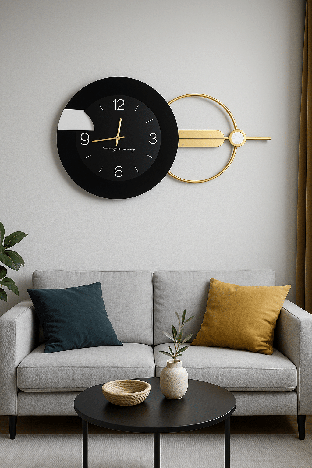 השעון "קיסר" הוא לא רק אמצעי למדידת זמן, אלא יצירת אמנות בפני עצמה. עם עיצוב גאומטרי ייחודי המשלב בין גווני זהב נוצצים לשחור קלאסי, השעון יוצר אמירה עיצובית שמדברת בעד עצמה. הקווים הנקיים והעיגולים המתמזגים יוצרים תחושת תנועה מתמדת, תוך שהם משדרים יציבות ורוגע. הצללים שמקרין השעון על הקיר מוסיפים לו מימד נוסף של עומק ותלת-ממדיות, מה שהופך אותו למוקד עיצובי בכל חלל שבו הוא תלוי.