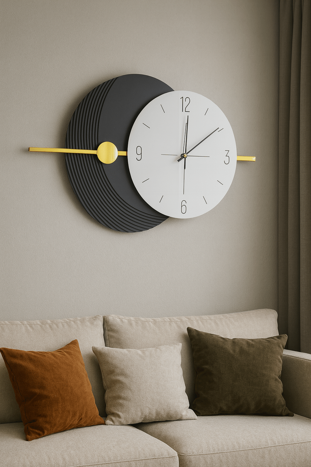השעון "אלגנטיות מודרנית" מתאים בצורה מושלמת מעל שולחן אוכל קטן או בפינת מטבח מרכזית. ניתן לשלב אותו עם עיצובי רהיטים בגוונים ניטרליים כמו שמנת או אפור בהיר, כדי להדגיש את הצבעים העזים של השעון. למי שמחפש תחושה חמימה ואינטימית, מומלץ לשלב את השעון עם עציצים קטנים או פריטים דקורטיביים נוספים בגוונים כתומים ואפורים. בחללי עבודה פתוחים, השעון יכול להוות מוקד עיצובי נעים שמוסיף אווירה קלילה ויצירתית.