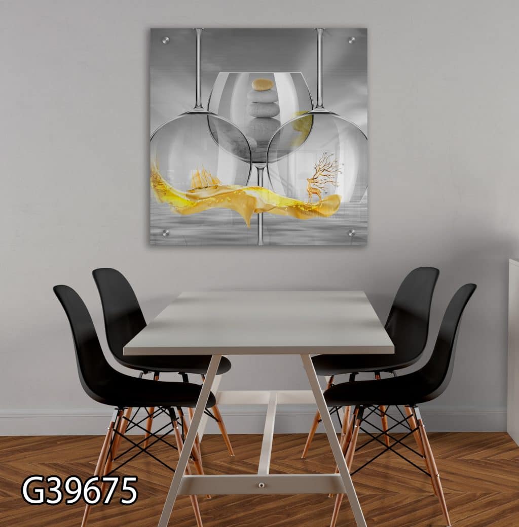 תמונת הזכוכית שלנו, דגם G39675, היא יצירת אמנות המשלבת את העדינות של צבעי האפור עם הברק היוקרתי של הזהב. התמונה מתאימה באופן מושלם לפינת האוכל או המטבח שלכם, ותורמת ליצירת אווירה אלגנטית ומודרנית. עם עיצוב הכולל אלמנטים של איילים, ים וכוסות, היא הופכת כל חלל ליצירת אמנות חיה ומרגשת.