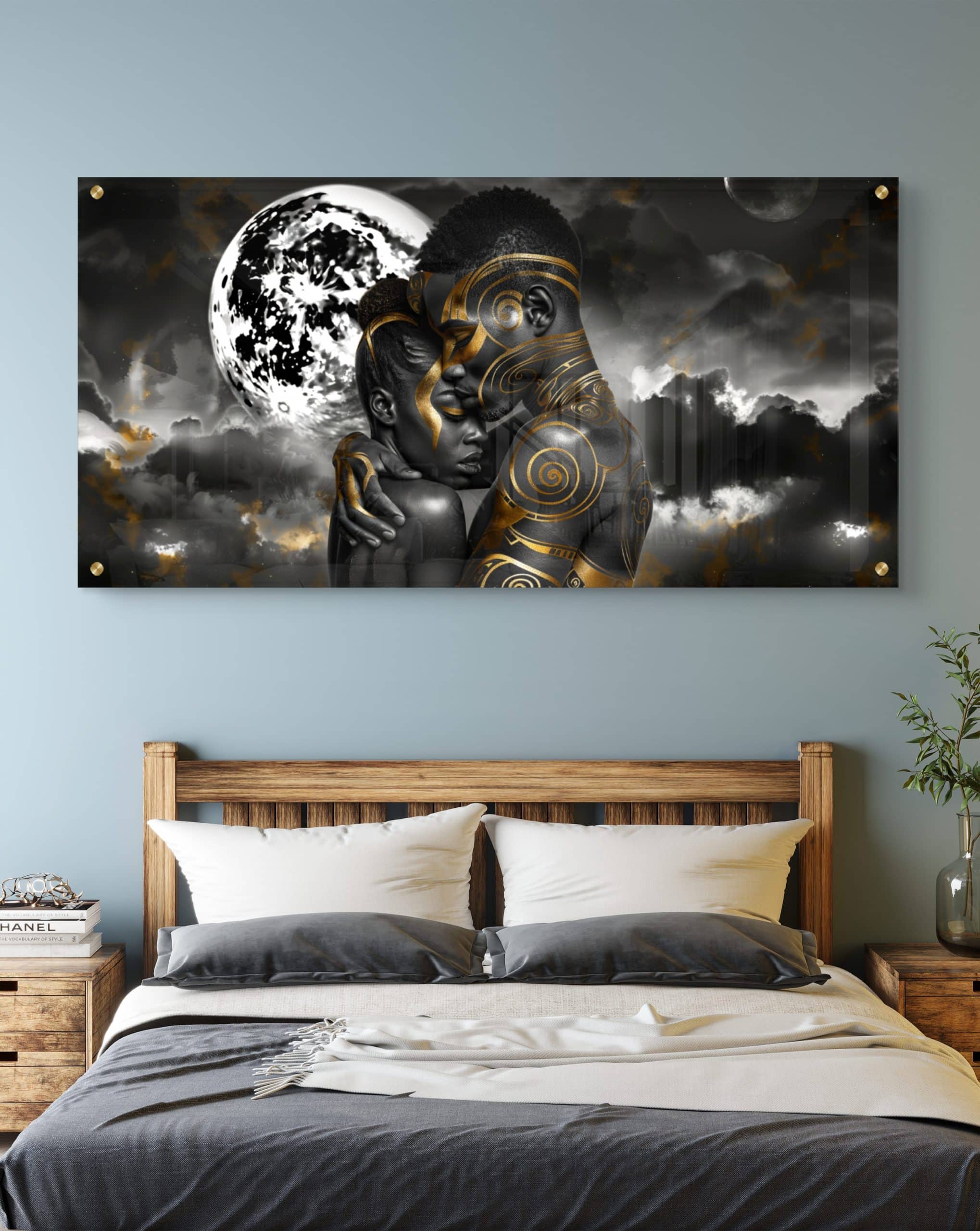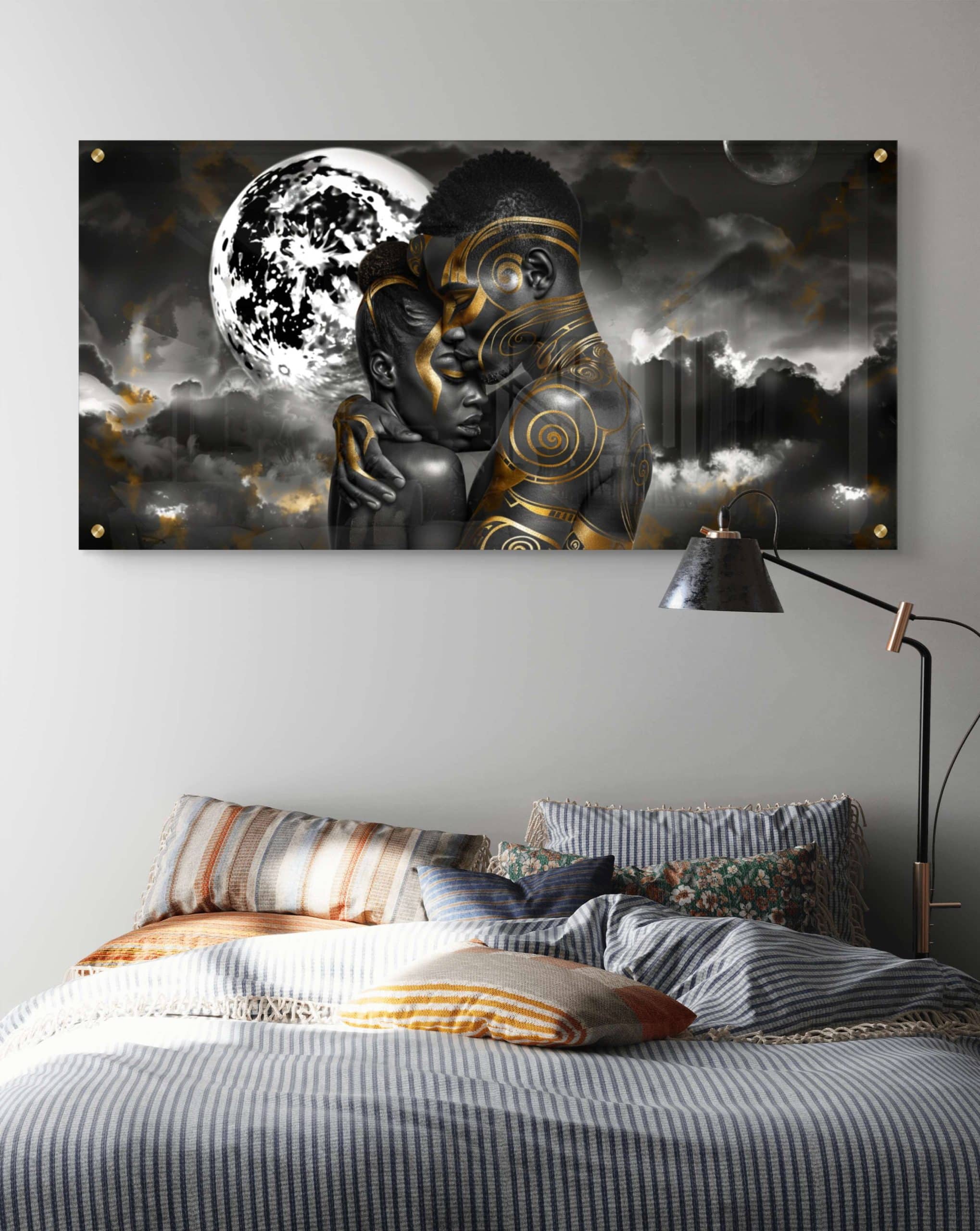 תמונת הזכוכית "חיבוק ירח" מביאה אלגנטיות ורומנטיקה לכל חלל. התמונה משלבת בין גווני שחור, לבן וזהב, ויוצרת אווירה מסתורית ומרגשת. מושלמת לעיצוב סלון מודרני, חדר שינה אינטימי או משרד יוקרתי. כל פרט בתמונה משדר תחכום ואסתטיקה עילאית, ומעניק לחלל נופך של יוקרה ושלווה.