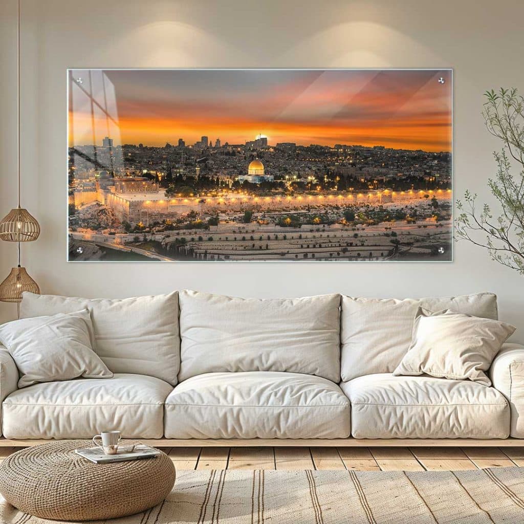 תמונה זו מתאימה במיוחד לסלונים גדולים, מבואות מעוצבות, משרדים יוקרתיים או חדרי ישיבות, בהם היא יכולה להוסיף תחושת הדר, רוגע ואווירה חמה. השילוב בין צבעי השקיעה לבין האורות של ירושלים יוצר חיבור מושלם בין מודרניות ואלגנטיות על-זמנית.