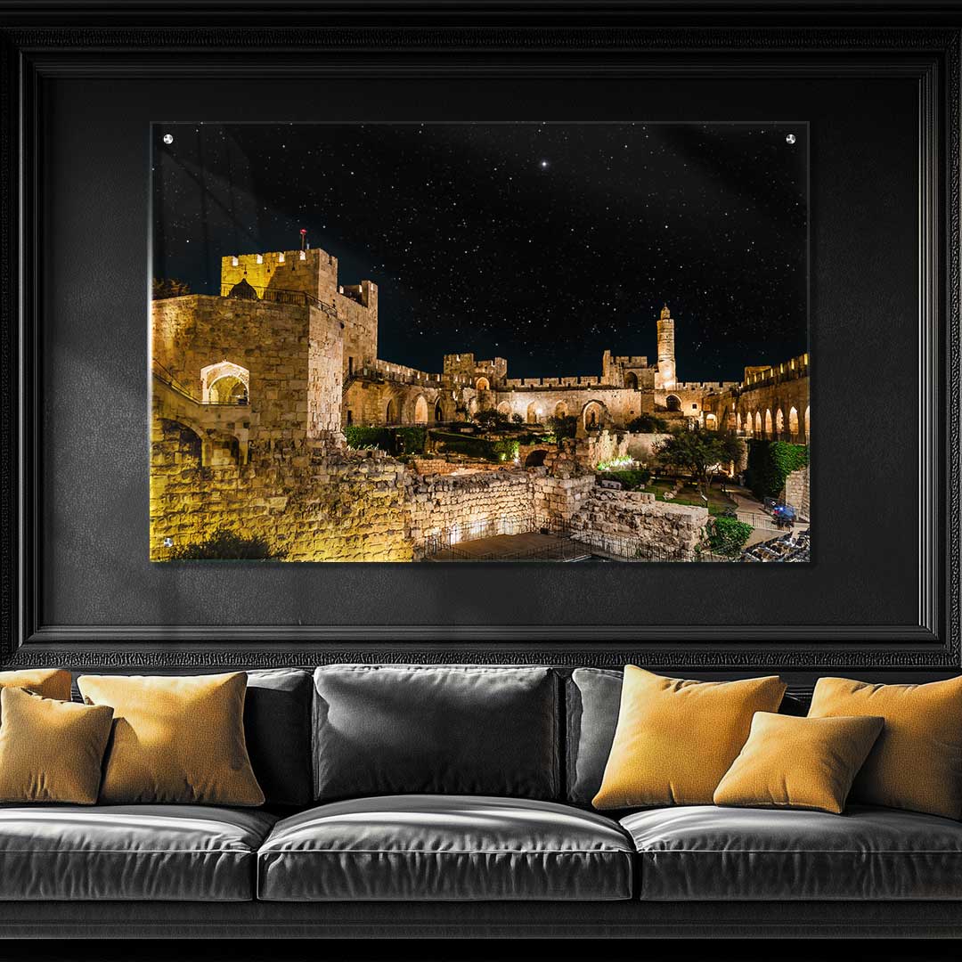 תמונת זכוכית ייחודית המציגה את מגדל דוד בלילה, מואר בתאורה רכה וקסומה על רקע שמיים זרועי כוכבים. גווני הזהב של האבן העתיקה משתלבים בהרמוניה עם הרקע השחור, ויוצרים אווירה אלגנטית ומרשימה. מתאים לסלונים יוקרתיים, מבואות מעוצבות וחדרי עבודה מרשימים.
