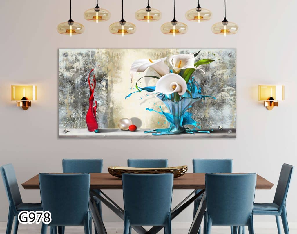 "שולחן השלווה" היא יצירת אמנות על זכוכית המשלבת עיצוב דקורטיבי עם אלמנטים צבעוניים ונועזים. התמונה מציגה קומפוזיציה ייחודית שבה אגרטל עם פרחים לבנים משתלב עם פרץ של צבע כחול, לצד אלמנטים דקורטיביים נוספים בגוונים של אדום וכסף. התוצאה היא תמונה עשירה ודינמית שמוסיפה חיות ואנרגיה לכל חלל שבו היא מוצבת.