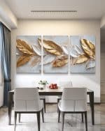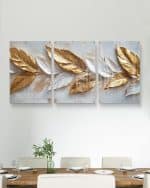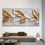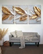 שלשת תמונות הזכוכית "נוצות זהב בטבע" מביאות אלגנטיות מודרנית לכל חלל. עם עיצוב נוצות מוזהבות על רקע טבעי, הן יוצרות אווירה של יוקרה ושלווה, ומתאימות לסלון, חדרי שינה, ומשרדים. השדרוג המושלם שימשוך את העין ויעניק מראה מעוצב לכל חדר.