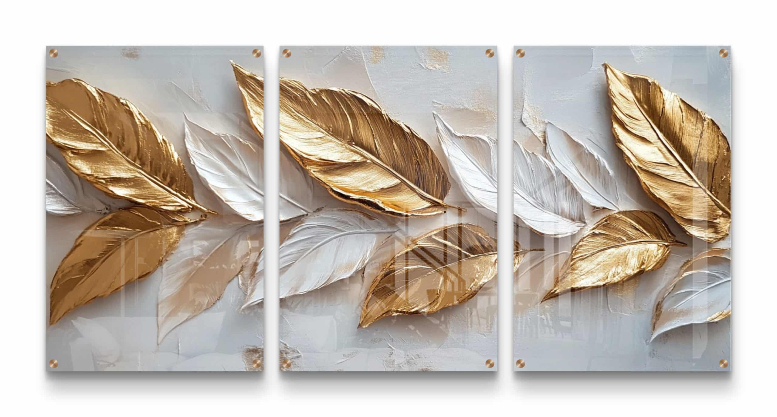שלשת תמונות הזכוכית "נוצות זהב בטבע" מביאות אלגנטיות מודרנית לכל חלל. עם עיצוב נוצות מוזהבות על רקע טבעי, הן יוצרות אווירה של יוקרה ושלווה, ומתאימות לסלון, חדרי שינה, ומשרדים. השדרוג המושלם שימשוך את העין ויעניק מראה מעוצב לכל חדר.
