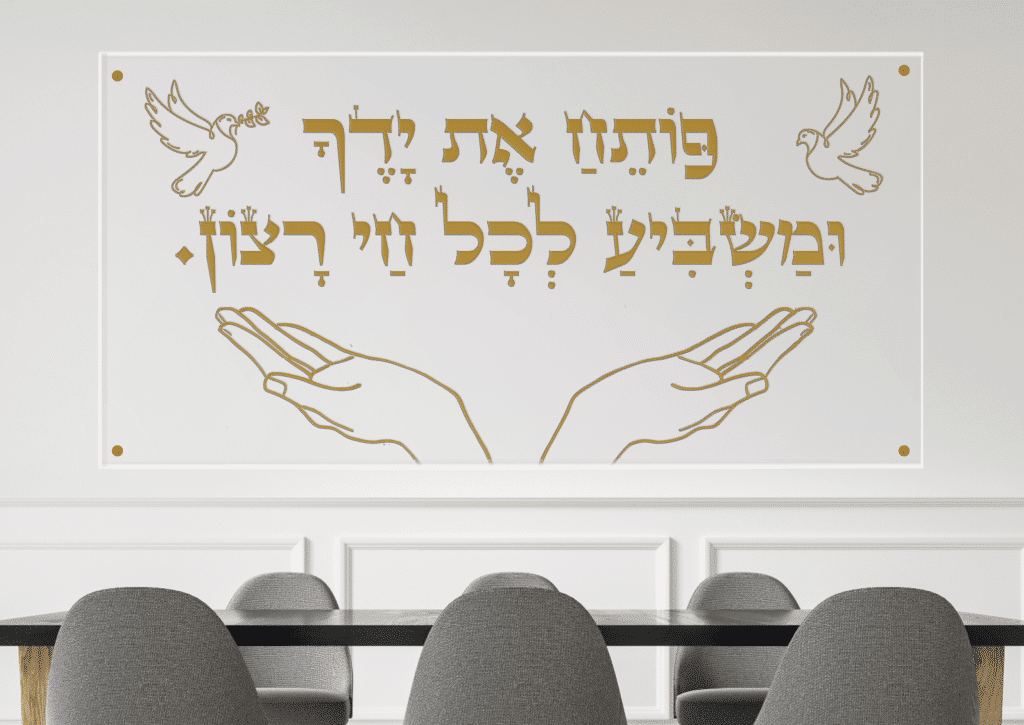 תמונת זכוכית "פותח את ידיך" בעיצוב עדין ומרשים המשלב כיתוב זהב ועיטורים אומנותיים של יונים וידיים פתוחות. רקע השקוף מאפשר לתמונה להשתלב בצורה מושלמת בכל חלל, בין אם מדובר בפינת אוכל, סלון או משרד המעוניין לשדר יוקרה, רוגע ורוחניות.