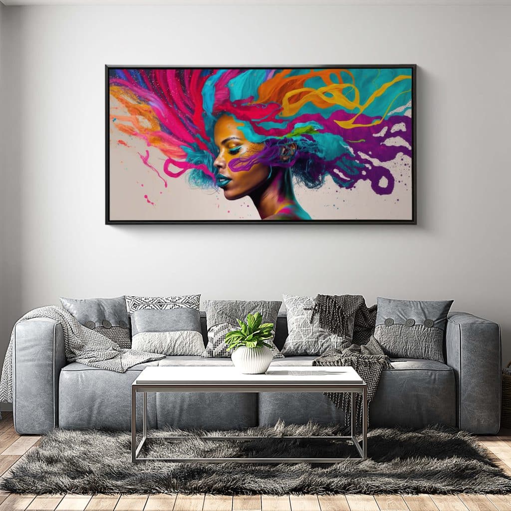 תמונת הקנבס "אישה עם שיער צבעוני" היא יצירת אמנות סוחפת שמהווה נקודת מוקד בכל חלל שבו היא מוצבת. התמונה מציגה דמות נשית עוצמתית בפרופיל עם שיער צבעוני המתפשט לכל הכיוונים בצורה אקספרסיבית, כאילו מדובר בפרץ של יצירתיות שיצא אל החופשי. הצבעים העזים – ורוד, כתום, טורקיז, צהוב וסגול – משתלבים יחד בהרמוניה מושלמת ויוצרים תחושת תנועה וחיות בתמונה.
