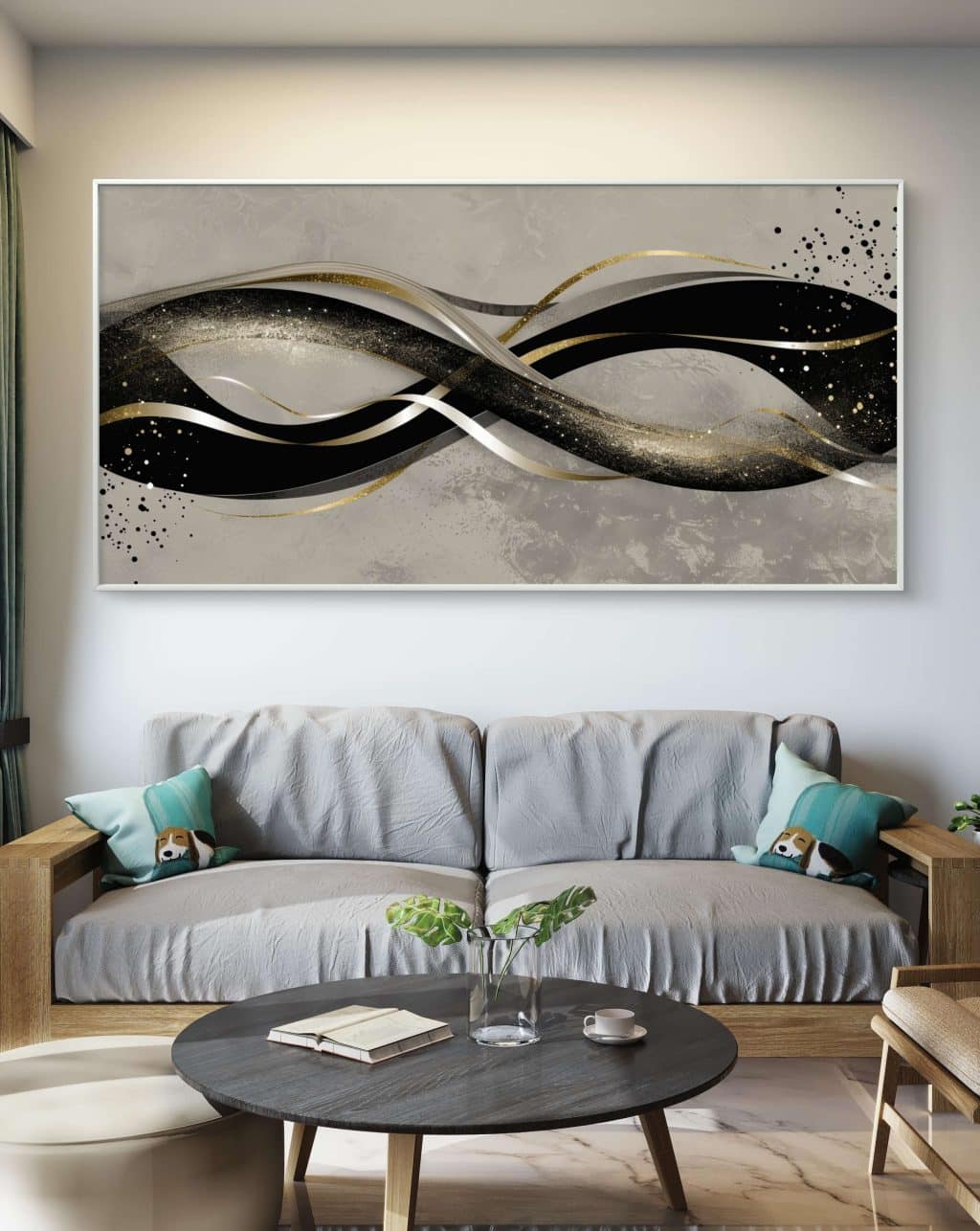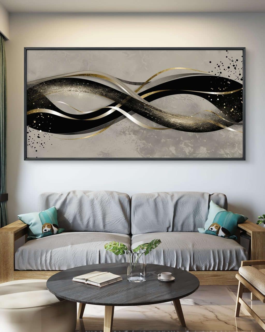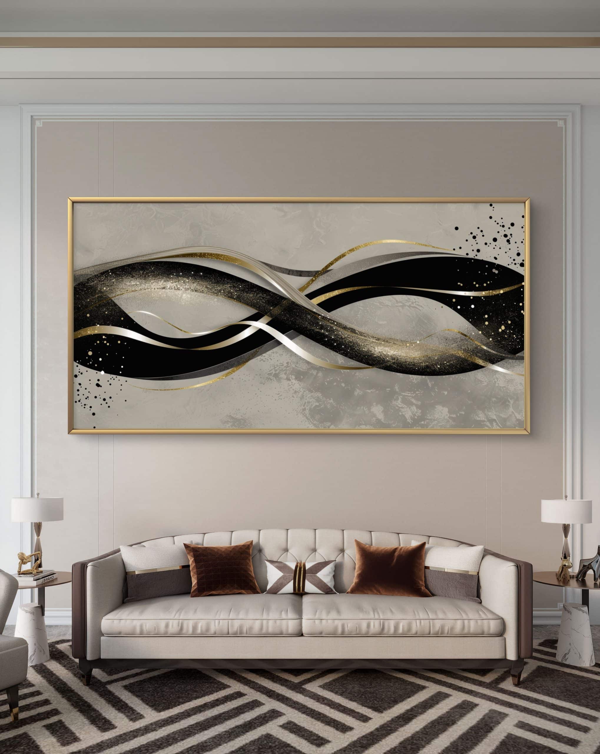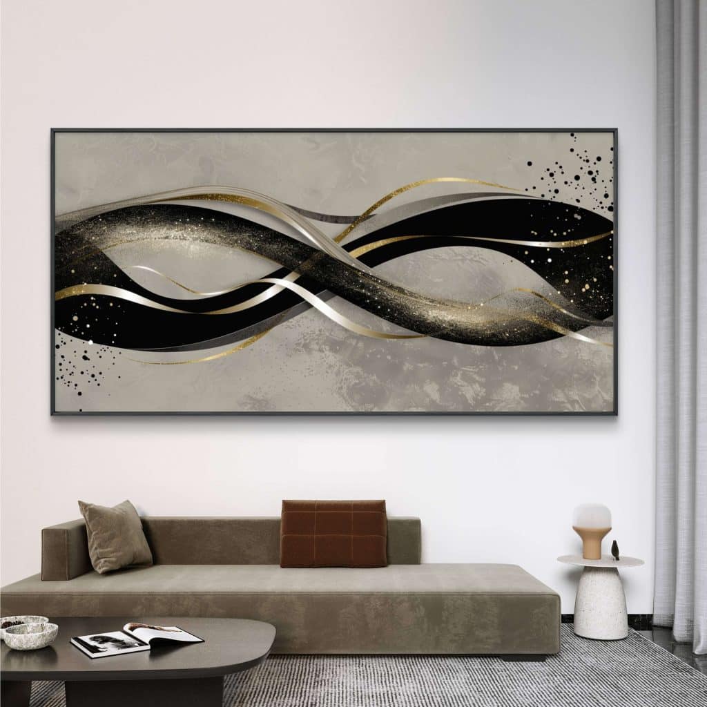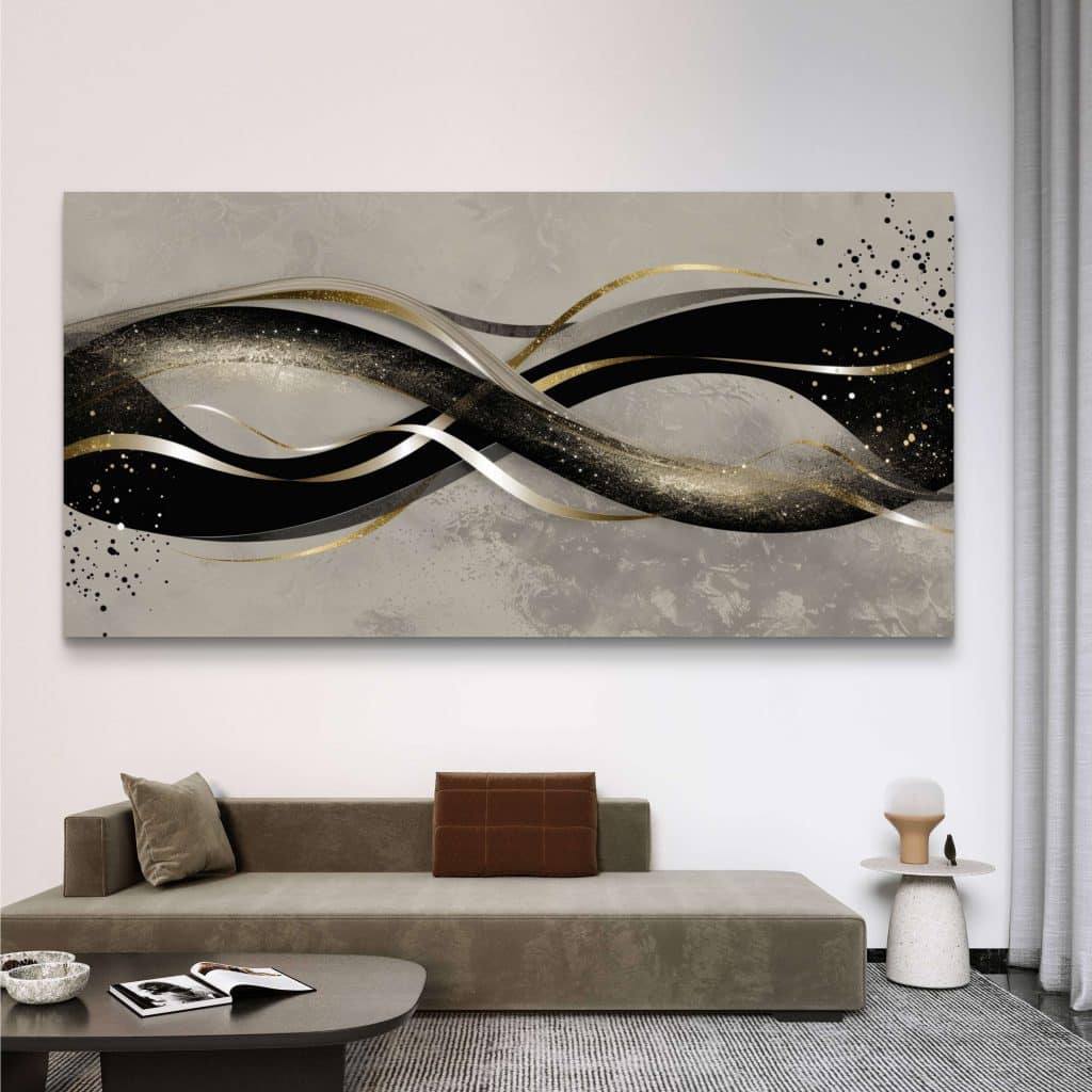 תמונת הקנבס "גלים של תחכום" מציעה נגיעה של יוקרה ואסתטיקה מתוחכמת לכל חלל. עם גלים אבסטרקטיים בצבעי שמנת, שחור וזהב, המוצר מתאים לעיצוב סלון, חדר שינה או משרד, ומשדר אווירה חמימה ומודרנית. התמונה מוסיפה רובד של עומק ואמנות לחללים מגוונים, ומבטיחה לגרום לכל מבקר להתרשם מהאווירה היוקרתית והייחודית.