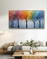 התמונה "יער הקשת בענן" מציגה עצים פורחים בצבעים עשירים ומרהיבים, הנפרשים מקצה אחד לקצה השני בשלל גוונים מרהיבים – מאדום וכתום ועד לכחול וירוק. כל עץ מוקף בפרחים ועיגולים צבעוניים המעניקים לתמונה מראה תוסס וחי, כשברקע כחול עדין שמוסיף עומק וניגודיות. היצירה משדרת שמחה ואנרגיה חיובית, ומתאימה במיוחד לסלון או חדר שינה בעיצוב מודרני, או לחללים ציבוריים המחפשים תוספת צבע ועניין.