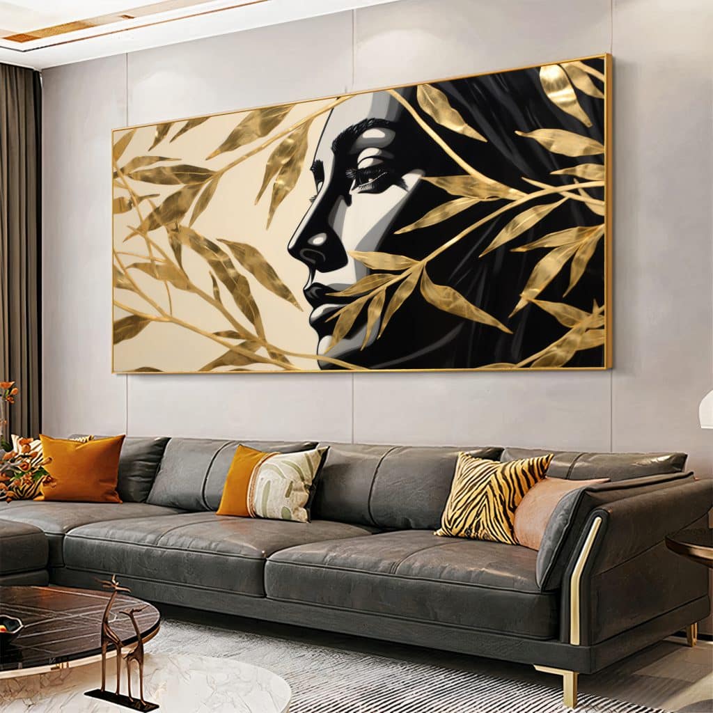 תמונת קנבס "פנים בין העלים" היא אחת מאותן יצירות שמעוררות תחושת השראה ושלווה עם נגיעה של עידון מודרני. הדיוקן המורכב מצבעים שקטים של שחור ולבן מבטא את ההרמוניה שבין האלמנטים האנושיים לטבעיים, כשהעלים המוזהבים שמקיפים את הפנים מוסיפים מימד של יוקרה וניגודיות מרשימה.