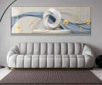 תמונת קנבס תלת-ממדית "תנועה גאומטרית בזהב וכחול" מציגה שילוב מופשט של קווים זורמים, עיגולים ותנועות מעגליות בגווני כחול וזהב. המראה המודרני והתלת-ממדי מעניק לתמונה תחושת עומק ודינמיות, בעוד הצבעים המטאליים והבהירים משדרים יוקרה ותחכום. התמונה מתאימה במיוחד לסלון מודרני, חדר שינה מעוצב או משרד המעוניין לשדר עידון ואלגנטיות.